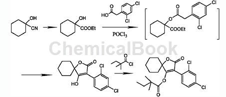 2,4-dichlorophenylacetic acid is a key intermediate for the new insecticide and acaricide spirodiclofen. spirodiclofen is a low-toxic miticide with a new structure developed by the company. it has contact killing and stomach poisoning effects, but has no systemic activity. it has a broad spectrum of killing mites, long lasting effect, and kills both eggs and young mites. spirobifen mainly inhibits the fat synthesis of mites and blocks the energy metabolism of mites. it is effective for all developmental stages of mites. it has outstanding ovicidal activity and has no cross-resistance with existing acaricides. it is suitable for use in control harmful mites that are resistant to existing acaricides. there is research and development of a preparation method for spirodiclofen and its intermediates. 3-(2,4-dichlorophenyl)-2-oxygen is prepared in one step using methyl hydroxycyclohexylcarboxylate, 2,4-dichlorophenylacetic acid, and the action of phosphorus oxychloride or phosphorus trichloride. generation-1-oxaspiro[4,5]dec-3-en-4-ol is finally reacted with 2,2-dimethylbutanoyl chloride to obtain spirodiclofen. this process has short reaction time, low reaction temperature, and the yield can be increased by more than 10% (based on 2,4-dichlorophenylacetic acid). this route is suitable for industrialization. its synthesis route is as follows: