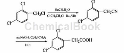 the specific steps are: add 27.1 g (95%, 0.58 mol) sodium cyanide and 100 g water to a 500 ml three-neck flask with a thermometer and mechanical stirring, stir until dissolved, then add 88.5 g (99% , 0.5 mol) 2,4-dichlorobenzyl chloride, 150 ml 1,2-dichloroethane and 1.5 g phase transfer catalyst n-tetrabutylammonium bromide, raise the temperature to 45~55°c, and keep the reaction for 10 hours. after the reaction is completed, add 150 ml of water to the reaction system, separate the layers, extract the water layer twice with 100 ml of 1,2-dichloroethane, combine the oil layers, and evaporate the 1,2-dichloroethane under normal pressure. cool to room temperature, add 150 ml xylene, 56.5 g sodium hydroxide and 36 g water, heat to 100~110°c, and keep warm for 2 h. after the reaction is complete, cool the reaction solution to 60°c, add 100 ml water and 125 ml (37%, 0.49 mol) concentrated hydrochloric acid with stirring, continue stirring at 5-10°c for 2.5 h, filter with suction, and use 200 ml for the filter cake. moisture 2 washes. after drying, a white to yellow powdery solid was obtained. after recrystallization with 250 ml of methanol, 87.8 g of white crystal 2,4-dichlorophenylacetic acid was obtained. the liquid chromatography analysis content was more than 99.0%, and the total yield in 2 steps was 84.8%. m.p.128.4 ~129.1℃