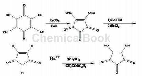mix the copper oxide catalyst obtained in the previous step with tetrahydroxybenzoquinone and anhydrous potassium carbonate in proportion to a three-necked flask, add deionized water, heat to reflux under magnetic stirring conditions for 40 to 60 minutes, and then cool to at room temperature, a yellow liquid was obtained; filter the above liquid, wash the filter cake with hot water, combine the filtrate and washing liquid, add sufficient concentrated hydrochloric acid to acidify; prepare a saturated solution of barium chloride, and pipette the saturated solution of barium chloride in into the above solution, then continue stirring and heating to 90°c; cool the liquid to room temperature, filter to obtain the yellow barium salt precipitate, put it into an oven and dry it at 100°c for 30 to 40 minutes; transfer the dried product to a three-necked flask, add no water methanol, add concentrated sulfuric acid under stirring conditions, heat to reflux for 20-30 minutes, the reaction is completed, cool and let stand, filter out the white barium sulfate precipitate; wash the obtained precipitate with ethyl acetate, and combine the washing liquid with the previous filtrate , the solvent was removed by rotary evaporation in a rotary evaporator to obtain yellow crystals, which were washed with acetone and then dried to obtain ketonic acid.