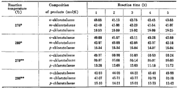 o-chlorotoluene is used as raw material and isomerized to prepare 3-chlorotoluene. use industrial grade o-chlorotoluene as the reaction raw material, analytically pure toluene and chlorobenzene as the diluent, and mix them evenly with o-chlorotoluene in a certain volume ratio. cylinders n2 and h2 are used as carrier gases. the isomerization reaction is carried out in a quartz tube integrating reactor, and the catalyst dosage is 7 to 8 grams. after the fresh catalyst was activated in the air at 500°c for 1 hour, it was lowered to the reaction temperature with n2, and fed into the reaction after constant temperature. the raw materials are transported by ultra-micro pumps, and the rapidly vaporized sample vapor is continuously brought into the catalyst bed by the carrier gas. the reaction products are condensed and collected according to a predetermined time. after the catalyst (hzsm-5) is coked and deactivated, it is regenerated by air at 500°c for 2 hours before being used for the reaction. the collected liquid product was analyzed by capillary chromatography. the product composition is shown in the figure below.