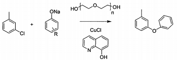 stir and mix 3-chlorotoluene, sodium phenolate, cuprous chloride, 8-hydroxyquinoline and polydiethylene glycol at room temperature in a reaction vessel, and heat until the temperature of the mixture is 130~140°c, then keep it warm and stir the reaction lasts for 8 to 9 hours, and finally, through high vacuum and reduced pressure distillation, the 100 to 110°c fraction is taken to obtain m-phenoxytoluene. the reaction equation is as follows. in this reaction, sodium phenolate and 3-chlorotoluene are used as raw materials, and m-phenoxytoluene is reacted in the next step under the action of a catalyst. m-chlorotoluene is both a reactant and a solvent.