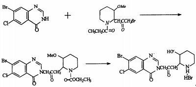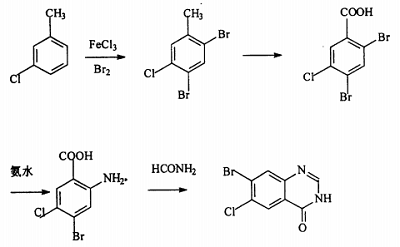 hydroxanone hydrobromide is 7-bromo-6-chloro-3-[3-(3-hydroxy-2-piperidinyl)-2-oxopropyl]-4(3h)-quinolinone , a natural alkaloid, was first used as a veterinary drug and has unique effects in fighting poultry coccidiosis. using 3-chlorotoluene as raw material and ferric chloride as catalyst, it undergoes bromination reaction with butane bromide and bromine to obtain 2,4-dibromo-5-chlorotoluene, which is produced by potassium permanganate, potassium dichromate or dichromate. magnesium oxide converts the methyl group into a carboxyl group to obtain 2,4-dibromo-5-chlorotoluic acid. it reacts with ammonia water or ammonia gas in the presence of cuprous chloride to selectively ammonate its ortho-bromine to obtain 2- methyl-4-bromo-5-chlorobenzoic acid is then cyclized in dmf solution using formamide to obtain 7-bromo-6-chloro-4(3h)-quinolinone, which is finally combined with 2-bromoacetonyl-3- methoxy-1-piperidinecarboxylic acid ethyl ester is condensed, hydrolyzed, and demethylated to prepare oftenanone hydrobromide. the reaction process is as follows.