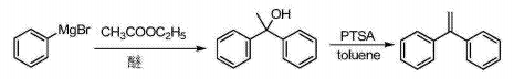 1) xavier creary (j.org.chem., vol.52, no.22, 1987) reported that at -78°c, a phenylmagnesium bromide solution was slowly dropped into ethyl acetate, and then 0 1,1-diphenyl ethanol is obtained by mechanical stirring at ~25°c; ep1167372a1 uses toluene as the solvent, and 1,1-diphenyl ethanol is refluxed and dehydrated under the catalysis of p-toluenesulfonic acid for two hours to obtain 1,1-diphenylethylene. . the reaction process route is as follows: