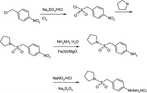 p-nitrobenzyl chloride (compound 2) is used as the starting material, and p-nitrobenzene methanesulfonyl chloride (compound 3) is prepared by sulfonation with sodium sulfite, chlorination with chlorine, and substitution with tetrahydropyrrole, and then treated with fe2o3-mgo catalyst compound 5 was obtained by reduction of hydrazine hydrate, and the target product (compound 1) was obtained through diazotization and reduction with insurance powder.