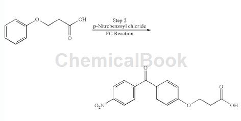 thionyl chloride was removed under reduced pressure. dichloroethane (1 l) was added and evaporated to give 4-nitrobenzoyl chloride as a solid. the solid was dissolved in dichloroethane (1 l). dichloroethane (10 l) was introduced into a 20 l glass flask and cooled to 0 °c. add aluminum chloride at 0-5°c. then, the 4-nitrobenzoyl chloride prepared above dissolved in dichloroethane was added dropwise at 0°c. phenoxypropionic acid was added in portions to the 3-phenoxypropionic acid reaction composition at 0.5°c and stirred at 25°c overnight. check tlc and quench the reaction composition in a mixture of hexanes (8 l) and ice-water (15 l). the composition was stirred and the solids were filtered off. the product was washed with hexane and dried. yield: 400 g (70% of theory), purity: 92.8% by hplc.