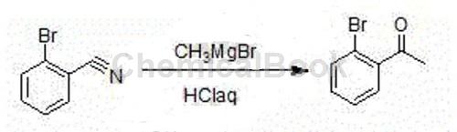 method 1: the synthesis method of high-purity 2′-bromoacetophenone includes the following steps: add methylmagnesium bromide grignard reagent in a container, and add o-bromine dropwise at room temperature. after adding the solution of benzonitrile in tetrahydrofuran, a large amount of white solid will appear; when the hplc spectrum detects that there is no raw material, stop the reaction; add it dropwise to the hydrochloric acid solution, separate the liquid, spin dry, and distill under reduced pressure to obtain a colorless liquid product (high purity2′-bromoacetophenone product). the molar ratio of o-bromoxynil and methylmagnesium bromide is 1:1.05. the detailed steps are as follows: the input amounts are as follows: o-bromoxynil: 91g, methylmagnesium bromide (2m): 262.5ml, thf (tetrahydrofuran, tetrahydrofuran): 90ml, concentrated hydrochloric acid: 60ml, toluene: 300ml. add 262.5ml of methylmagnesium bromide (2m) into the 500ml reaction bottle, control the reaction temperature at 20-25℃, add dropwise 91g of o-bromoxynil and 90ml of thf solution, and control the reaction temperature at 20-25℃it takes about 2 hours to complete the dropwise addition. after the addition, a large amount of white solid will appear. react at this temperature for another 1 hour. use hplc to monitor the reaction. when the reaction liquid raw materials disappear, stop the reaction. add the reaction liquid dropwise to 60ml concentrated hydrochloric acid and 300ml water, separate the liquids, extract the aqueous phase with 300ml toluene, combine the organic phases, wash with 200ml water, and reduce the pressure. -0.095mpa concentrate until no more liquid distills out. distill under reduced pressure, collect 131-135℃ (-0.095mpa) fraction, and obtain 95g of colorless transparent liquid 2’-bromoacetophenone. determined density: 1.48 (20℃), reaction yield (based on o-bromoxynil) 95.5%.