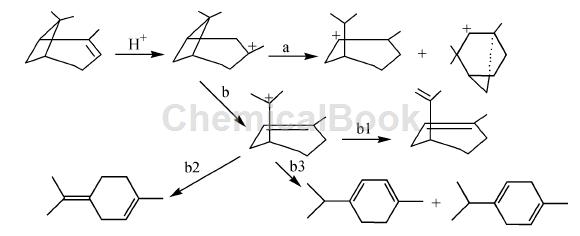 it mainly uses t-pinene as the starting material. t-pinene is first ring-opening and isomerized into monocyclic terpenes, and then undergoes catalytic dehydrogenation to produce p-cymene. the acid-catalyzed ring-opening isomerization reaction of t-pinene was studied. under acidic conditions, the π bond in the double bond of t-pinene was broken, and a stable tertiary carbocation was first formed. the formed tertiary carbocation was further formed due to tension. for isomeric rearrangement, if an organic acid is used as a catalyst in a low-polarity solvent, process a mainly occurs; if an inorganic acid is used as a catalyst in a polar solvent, process b occurs, as shown in the figure. the subsequent dehydrogenation reaction used copper formate-nickel formate (cu: ni= 1: 1) and w-5 type raney-ni catalyst.