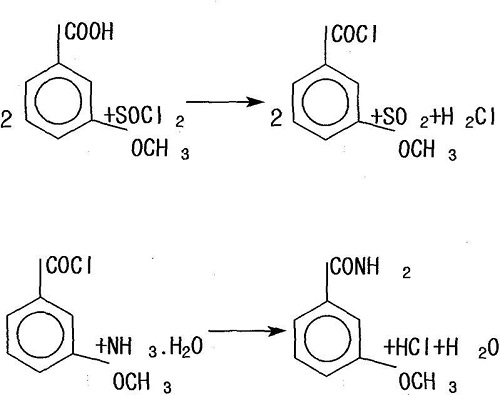 2) preparation of 3-methoxybenzoyl chloride and m-methoxybenzamide: add the above-mentioned m-methoxybenzoic acid and toluene into the container, mix the two evenly, and then add chlorine perform an acid chlorination reaction with sulfoxide to obtain a mixed solution containing m-methoxybenzoyl chloride; add ammonia water and ice cubes to another container, and then put the above-mentioned mixed solution containing m-methoxybenzoyl chloride into ice for hydrolysis , m-methoxybenzamide is obtained after centrifugation, water washing, draining and drying;