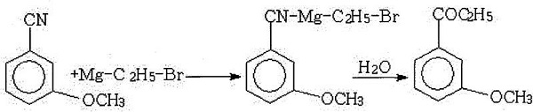 3) preparation of m-methoxybenzonitrile: add m-methoxybenzamide, acetonitrile and phosphorus oxychloride in a container to form a mixed solution containing m-methoxybenzamide; in another container add ice water to the mixture, and then put the above mixture containing m-methoxybenzamide into the solution for hydrolysis, and obtain m-methoxybenzonitrile after layered washing and distillation;