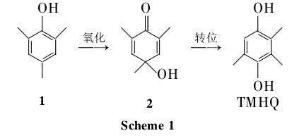 the mesitylenol method uses naoh as a catalyst, and mesitylene (1) is oxidized into 4-hydroxy-2,4,6-trimethyl-2,5-cyclohexadienone (2) in high-pressure oxygen. ; 2 was synthesized by methyl translocation at 250°c and then reduction to synthesize tmhq (scheme 1), with a total yield of 47%. l can be synthesized by methylation of phenol or extracted from the by-product of the synthesis of 2,6-dimethylphenol, so the mesitylenol method has great practical value.