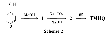 after phenol (3) and methanol [n(phenol):n(methanol)=1:5] are vaporized and mixed respectively, they enter the two-stage fixed-bed isothermal reactor and conduct gas-solid phase at 450℃-500℃. catalytic reaction, 1 is obtained through condensation and distillation; 1 is passed into sodium carbonate and sodium hydroxide solutions with steam to undergo bamherger transposition reaction to obtain 2; finally treated with alkali to obtain tmhq (scheme 2), with a total yield of 60%.