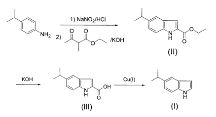 using p-isopropylaniline as raw material, diazotization, cyclization reaction with ethyl-2-methyl-acetoethyl ester and koh to obtain ii, which was dissolved in ethanol, degreased with koh, and acidified with crude acid to obtain iii. add iii to a high boiling point solvent and deacidify it with cuprous salt to obtain 5-isopropyl indole (i). compared with the existing inventions, this method obtains a new indole derivative, 5-isopropyl indole, which plays an important role in the construction of drugs and biological activities. it is comparable to the current preparation of alkyl-substituted indole derivatives. ratio, the synthesis route is cutting-edge, the raw materials are cheap, and the yield is high, up to 60%~70%.