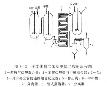 diamine continuous production process, the flow chart is as follows. it can be seen from the figure that the raw material aniline and the catalyst hydrochloric acid enter the mixer l in proportion. aniline hydrochloride is generated, and then formaldehyde aqueous solution is added to the mixer 2 at 60-80°c, and pumped into the continuous condensation reactor 4 through the pump 3. the temperature is maintained at 110-150°c, the reaction time is 15s-5min, and the pressure is 70kpa· s. the reaction material is input into the neutralization tank 6 from the discharge valve 5, and then neutralized with caustic soda aqueous solution, and the salt aqueous solution is separated through the separator 7. then, the reaction crude product passes through the tubular distiller 8 and the separator 9 to separate trace amounts of water and aniline, and the remaining part is the crude diphenylmethanediamine (mda).