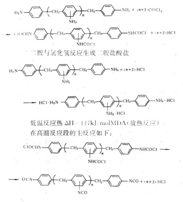 the principle and process of phosgenation of amine compounds have been described in the previous section. here are just examples. the phosgenation of diphenylmethanediamine is divided into two steps: low-temperature reaction and high-temperature reaction. the main reactions in the low-temperature reaction section are as follows.