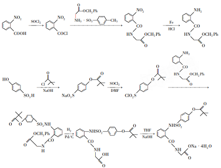 using glycine benzene ester p-toluenesulfonate, p-hydroxybenzenesulfonic acid, pivaloyl chloride and o-nitrobenzoic acid as the main raw materials, o-nitrobenzene is first synthesized by reacting o-nitrobenzoic acid with dichlorosulfoxide. formyl chloride, and then combined with glycine benzyl ester p-toluenesulfonate to prepare o-nitrobenzoyl glycine benzene ester, and then reduce the amino group to obtain anthranilamide glycine benzene ester, and then combine it with p-nitrobenzoyl glycine benzene ester obtained from p-hydroxybenzenesulfonic acid. pivaloyloxybenzenesulfonyl chloride reacts to obtain n-[o-(p-pivaloyloxybenzenesulfonamide) benzoyl]glycine benzyl ester, which can be reduced and alkalized to obtain sivelast sodium.