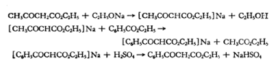 add 600 grams (570 ml, 4 moles) of ethyl benzoate to the cooled residue of ethyl acetoacetate sodium salt. change the steam bath to an oil bath, raise the bath temperature to 140-150°c, and keep it warm for 6 hours. then gradually increase the bath temperature to 180°c within 1 hour. the distillate collected during the heating process is 200-210 grams, the main components are ethyl acetate and ethanol.
