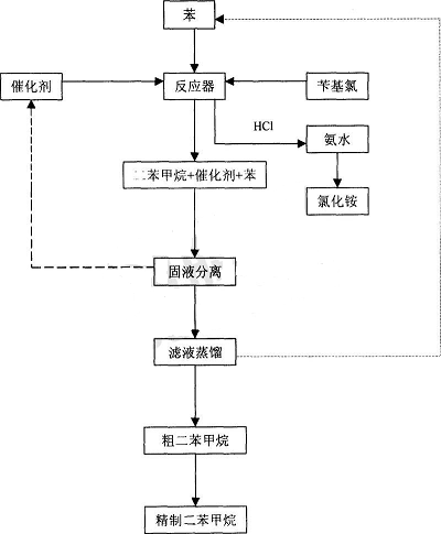 method 2: a catalytic synthesis process of diphenylmethane with simple reaction process, green environmental protection, clean and efficient: