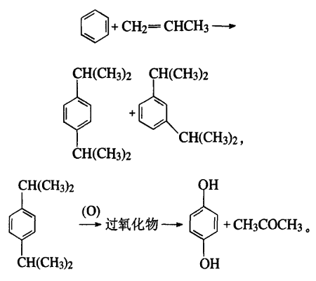 the process is roughly as follows: the alkylation reaction of benzene and propylene produces para-cumyl and meta-cumyl. para-cumene is separated and oxidized into dicumyl oxide, which is catalytically decomposed into 1,4-diphenol and acetone.