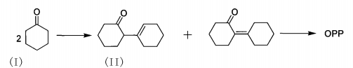 among them, 2-(1-cyclohexenyl)cyclohexanone (i) and 2-cyclohexylalkylenecyclohexanone (ii) are isomers. there is no need to separate them during synthesis and can be directly dehydrogenation under the action of catalyst produces opp. this method has convenient sources of raw materials, low cost, generates water and hydrogen at the same time, has less pollution, and is suitable for industrial production.
