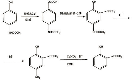 there have been relevant reports on the synthesis of o-hydroxyacetophenone. wang guoxi (“journal of chinese pharmaceutical industry”, 1999, 30(5), 232-233) reported that phenol was used as raw material, reacted with acetic anhydride to form ester, and then fries rearrangement was performed in carbon disulfide solvent to obtain o-hydroxyacetophenone and p-hydroxyacetophenone, the ratio is 2:3. the disadvantage of this method is that carbon disulfide is used as a solvent, which has a pungent smell, is volatile, highly toxic, and inconvenient to handle, and the yield of o-hydroxyacetophenone is only 33%.