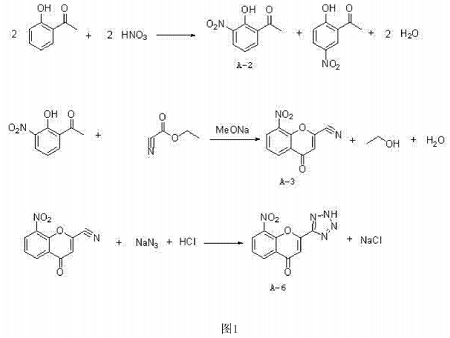 cn201410229357.7 provides a synthetic method for preparing 8-nitro-2-tetrazolyl-4-carbonylbenzopyran from 2′-hydroxyacetophenone, aiming to simplify the operation, reduce costs, and improve the yield of the reaction is high and it is easy to realize industrial production. the object of the present invention is achieved through the following technical solutions: the synthesis method of 8-nitro-2-tetrazolyl-4-carbonylbenzopyran, using o-hydroxyacetophenone as the starting material, first nitrating with nitric acid , to generate a mixture of 2-hydroxy-3-nitroacetophenone and 2-hydroxy-5-nitroacetophenone, which is then separated and purified by salt formation with an inorganic base, and then hydrolyzed with acid to obtain 2-hydroxy-3-nitroacetophenone. nitroacetophenone (a-2); 2-hydroxy-3-nitroacetophenone (a-2) undergoes cyclization reaction with ethyl cyanoformate to generate 8-nitro-2-cyano-4 -carbonylbenzopyran (a-3), finally reacts with sodium azide to form 8-nitro-2-tetrazolyl-4-carbonylbenzopyran (a-6).