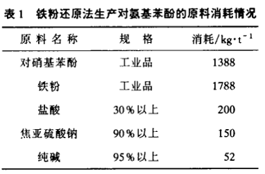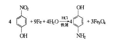 对硝基苯酚经铁屑在酸性介质中还原生成对氨基苯酚粗品,再经焦亚硫酸钠溶液浸渍,过滤干燥而得到成品,具体反应式为: