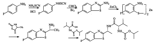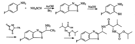 method 1: add bromine dropwise to p-fluoroaniline and ammonium thiocyanate in acetic acid solvent to obtain 2-amino 6-fluorobenzothiazole, and then hydrolyze in 50% sodium hydroxide solution to obtain key intermediate 2 -amino-5-fluorothiophenol, obtained by reacting 2-amino-5-fluorothiophenol with alanine 4-carbonyl anhydride-4-methyl-1,3-oxazoline.2,5.dione 1-(6-fluoro-2-benthiazole)ethylamine is then reacted with iv isopropylcarbonyl and valine to obtain the target product benthiazole. this route uses glacial acetic acid as the solvent when synthesizing 2-amino-6-fluorobenzothiazole. since the reaction temperature is required to be 8 to 10°c, the reaction solution is easy to freeze, making the operation difficult, and glacial acetic acid is difficult to recycle. . in addition, this route also has the hydrolysis of 2-amino-6-fluorobenzothiazole.the disadvantage of 2-amino-5-fluorothiophenol is that it is easily oxidized.