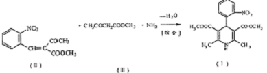 a method for preparing nifedipine is: in the same reactor, first make o-nitrobenzaldehyde (iv) and methyl acetoacetate (iii) generate benzylidene under the catalysis of pyridine carboxylate base compound (ii):
