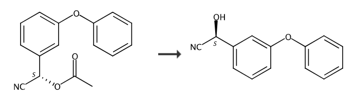 first add 0.5g (1.88mmol) s-cyanohydrin acetate into the erlenmeyer flask, then add 87ul (0.94mmol) buoh, 0.05mg candida antarctic lipase (novo 435) and 10ml isopropyl ether , placed in a shaker at 10°c for 72h. then concentrate the reaction solution to dryness, dissolve it with 20 ml of a mixed solution (composed of 6 ml of water, 14 ml of methanol, and 6 ml of benzene), separate the layers, remove the lower solution, and use 10 ml of a mixture of benzene and methanol (the volume ratio of benzene and methanol is 7 :3) extract twice, evaporate part of the methanol, add ea to remove the water layer, dry the ea layer and concentrate to obtain 0.06g of (s)-(3-phenoxyphenyl)hydroxyacetonitrile.