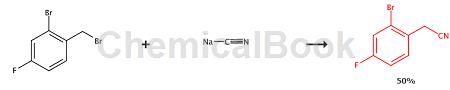heat a solution of nacn (2.0 equiv) in dmso (6 ml) to 90 °c. the oil bath was removed and 2-bromo-4-fluorobenzyl bromide (1.0 equiv, 6.09 mmol) was slowly added. after the mixture reached 50 °c, water (120 ml) was added. the mixture was extracted with ch2cl2 (3 × 50 ml). the combined organic extracts were washed with brine, dried (na2so 4), filtered and concentrated under reduced pressure. the crude product, 2-(2-bromo-4-fluorophenyl)acetonitrile, was purified by flash chromatography on silica gel (hexane/ethyl acetate: 9/1) as a white solid. yield 50%, 1h nmr (400mhz, dmso-d6): δ7.70 (dd, j = 8.6, 2.7hz, 1h), 7.61 (dd, j = 8.6, 6.0hz, 1h), 7.34 (dt, j = 8.6), 2.7hz, 1h), 4.07 (s, 2h).