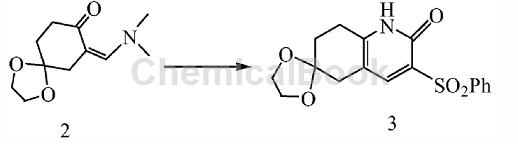the specific preparation process is: in a 2l three-necked flask, add compound 2 (211g, 1mol) and phenylsulfonylacetonitrile (181g, 1mol) obtained in the previous step respectively. the chemical structural formula of phenylsulfonylacetonitrile is: c 6h5so2ch2cn. then add 500l of ethanol and install a reflux condenser to heat the reflux reaction. tlc detected the reaction progress. after 1 hour of reaction, the reaction was complete. stop heating and cool naturally. at this time, a large amount of solid precipitated. filter the solid, wash with a small amount of ethanol, and dry to obtain a white solid 2-keto-3-phenylsulfonyl-6-ethylene glycol ketal-5,6,7,8-tetrahydroquinoline (compound 3 ) 185g (yield 53.3%).
