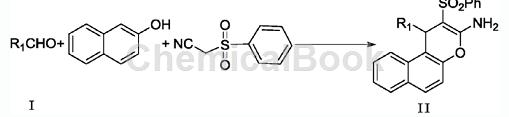 1. in the process of preparing naphthopyran derivatives using ionic liquid catalyzed one-pot method, the method is carried out as follows: aldehyde derivatives shown in formula i, β-naphthol, benzene sulfonyl acetonitrile and ionic liquid catalyst are added to the solvent, and stirred at 0-80°c and normal pressure for 2-18 hours. after the reaction is complete, the reaction liquid is obtained and after post-processing, 2-amino-3-benzene represented by formula ii is obtained. sulfone-4h-naphthopyran derivatives. the present invention prepares 2-amino-3-phenylsulfone-4h-naphthopyran derivatives with mild reaction conditions, short reaction time, convenient separation and purification, good yield, and easy expansion of substituents; and using ionic liquid catalysis, it has the advantages of being pollution-free, environmentally friendly, and the catalyst can be reused, making it a promising synthesis method.
