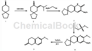 the synthesis method includes the following steps: a. compound 1 and dmadmf (n,n-dimethylformamide dimethyl acetal) are added to the dmf (n,n-dimethylformamide) solution, and the temperature is raised to the reaction was carried out with constant stirring at 70°c for 2 hours; then dmf (n,n-dimethylformamide) and remaining dmadmf (n,n-dimethylformamide dimethyl acetal) were removed under reduced pressure to obtain compound 2 ; b. add compound 2 and phenylsulfonyl acetonitrile in step a to ethanol, and heat to reflux for 1 hour at 85°c, then filter the obtained product, wash the obtained solid with ethanol, and then dry it that is, compound 3 is obtained; c. add dimethyl sulfate dropwise to the reaction system consisting of compound 3, potassium carbonate and tetrahydrofuran in step b, and reflux and heat for 2 hours at 80°c, cool to room temperature, and then after three extractions with ethyl acetate, combine the organic phases, concentrate to dryness, and finally beat with a small amount of ethanol, filter and dry to obtain compound 4; d. add dmf (n, n-dimethylmethane) to compound 4 in step c. formamide) and water, and then add sodium dithionite in batches, and then react at 80°c for 5 hours; then cool to room temperature; then filter to collect the filter cake, and then add concentrated hydrochloric acid to the filter cake , stir and heat to reflux for 2 hours, adjust the ph with saturated sodium carbonate solution, then extract three times with ethyl acetate, combine the organic phases, and concentrateto dryness, and then beat with ethanol to obtain compound 5, that is, 2-methoxy-7, 8-dihydroquinolin-6(5h)-one.