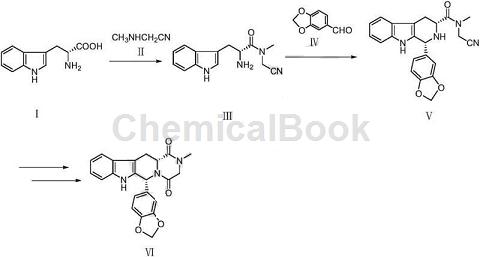 in early 2014, the drug was approved by the us fda as a new indication for the treatment of benign prostatic hyperplasia, and the market capacity will be broader in the future. some studies have developed a preparation process. 1) d-tryptophan and methylaminoacetonitrile or methylaminoacetonitrile hydrochloride are used as starting raw materials to condense to obtain the compound represented by formula iii. 2) formula iii and piperonal undergo pictet- after spengler cyclization reaction, the compound represented by formula v is crystallized. 3) compound v is hydrolyzed under acidic or alkaline conditions and then condensed to obtain the target product tadalafil. the above method avoids the use of chemical raw materials such as sulfoxide dichloride, chloroacetyl chloride, and methylamine, which are highly toxic, cause serious environmental pollution, and are flammable and explosive. the reaction method is simple, the operation is convenient, and the yield is high.