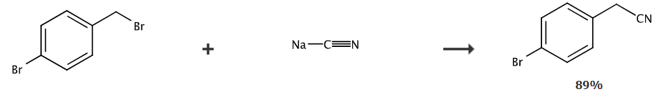 a suspension of 4-bromobenzyl bromide (5.00 g, 0.020 mol) and sodium cyanide (1.18 g, 0.024 mol, 1.2 equiv) in dmf-water (9:1, 35 ml) was incubated at 40° c for 12 hours. the reaction mixture was quenched with water and extracted with etoac. the combined organic matter was washed with nacl (sat) and dried with na2so4. the solvent was removed under reduced pressure to give 3.9 g (89%) of the desired product.