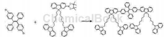 place 1,2-bis(4-bromophenyl)-1,2-diphenylethylene and 2-(4,4,5,5-tetramethyl-1,3,2-dioxa pentaborane)-9,9-(n-carbazole-hexyl)fluorene, chromatographically pure toluene, sodium carbonate aqueous solution (2m/l), and absolute ethanol were placed in a round-bottomed flask, and the catalyst pd ( pph3)4, the reaction system was refluxed and stirred at 90°c for 48 hours. after the reaction was completed, the system was cooled to room temperature, an appropriate amount of water was added to the system and then dichloride was added. after extraction with methane, the extract was concentrated and separated by column chromatography (eluent was petroleum ether: dichloromethane 4:1) to obtain the target product as a light yellow solid.