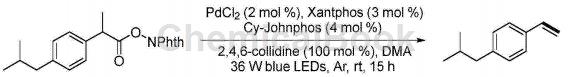 add photocatalyst palladium chloride (2mol%, 0.7mg), 4,5- bisdiphenylphosphine-9,9-dimethylxanthene (l1) (3mol%, 3.5mg), 2-(dicyclohexylphosphino)biphenyl (l2) (4mol%, 2.8mg) and active aliphatic nhpi ester (0.2mmol, 80.2mg). completely replace the air in the tube with argon three times, and then add 2,4,6-trimethylpyridine (0.2 mmol, 24.2 mg) and 2 ml of n, n-dimethylacetamide (dma) under an argon atmosphere. the reaction system was continuously stirred at room temperature for 15 hours under the irradiation of a 36w blue led lamp (using an ika magnetic stirrer, rct basic type, stirring speed 500 rpm). after the reaction is completed, the reaction is quenched with h2o, and the reaction solution is extracted with ethyl acetate (3*10ml), and the combined organic phase is concentrated by rotary evaporation (swiss buchi co., ltd., buchi rotary evaporator r-3) . the concentrated residue was passed through chromatography column (beijing xinwei glass instrument co., ltd., c383040c chromatography column with sand plate storage ball, 35/20, effective length: 500mm) to obtain the product.