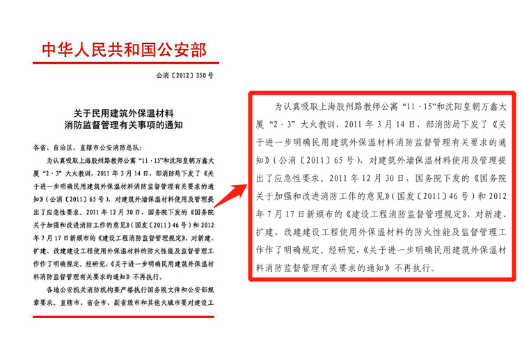 in order to conscientiously absorb shanghai jiaozhou road teachers apartment<font face lessons learned from the "11·15" and "2·3" fires in shenyang dynasty wanxin building. on march 14, 2011, the ministry of fire protection bureau issued the "about further clarifying the fire supervision and management of external insulation materials for civil buildings" "notice on requirements" (public notice [2011] no. 65), which puts forward emergency requirements for the use and management of building exterior wall insulation materials. on december 30, 2011, the state council issued the "opinions of the state council on strengthening and improving fire protection work" (guofa [2011] no. 46) and the newly promulgated "regulations on fire protection supervision and management of construction projects" on july 17, 2012. clear provisions are made on the fire protection performance and supervision and management of external insulation materials used in new construction, expansion and reconstruction construction projects. after research, the "notice on further clarifying the relevant requirements for fire supervision and management of exterior insulation materials for civil buildings" will no longer be implemented.