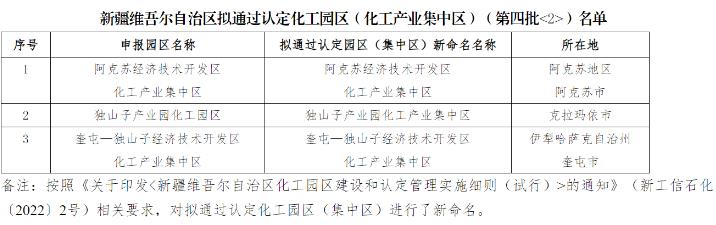 on october 24, the department of industry and information technology of the xinjiang uygur autonomous region issued an announcement that the xinjiang uygur autonomous region plans to pass the certification of chemical industry parks (industrial concentration areas) (the fourth batch). three chemical industry parks (chemical industry concentrated area) is planned to be recognized, and the publicity period is: october 23 to november 10, 2023 (15 working days).