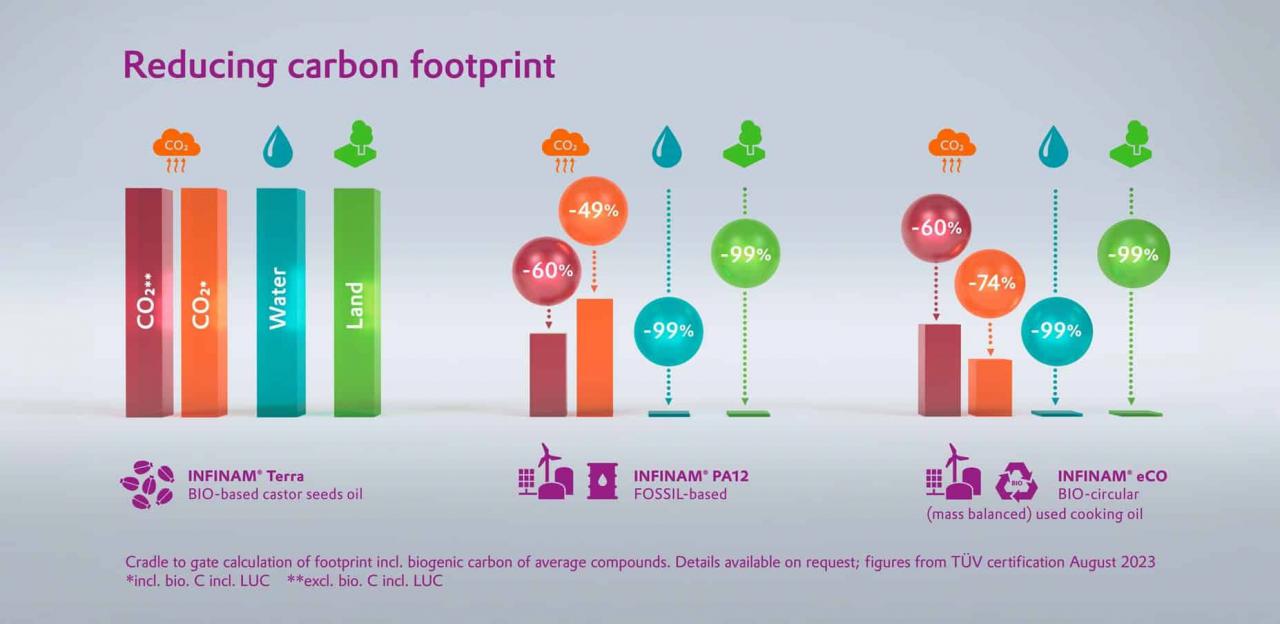 pa12 is based on the mass balance method and is made from waste cooking oil, which can 100% replace fossil raw materials. with infinam®