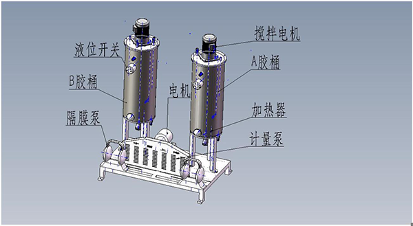 4.a set of feeding heating mixing barrels includes a,b glue barrel, stirring device, diaphragm pump, heater, liquid level