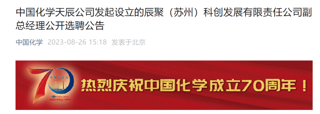 on august 26, the deputy general manager of chenju (suzhou) science and technology innovation development co., ltd., established by china chemical tianchen company, was publicly announced.