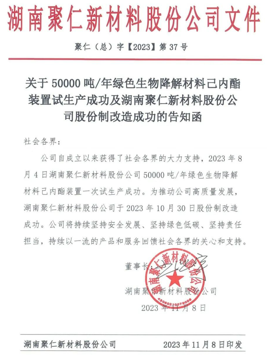 on november 8, hunan juren chemical announced the successful trial production of a 50,000-ton/year green biodegradable material caprolactone unit.