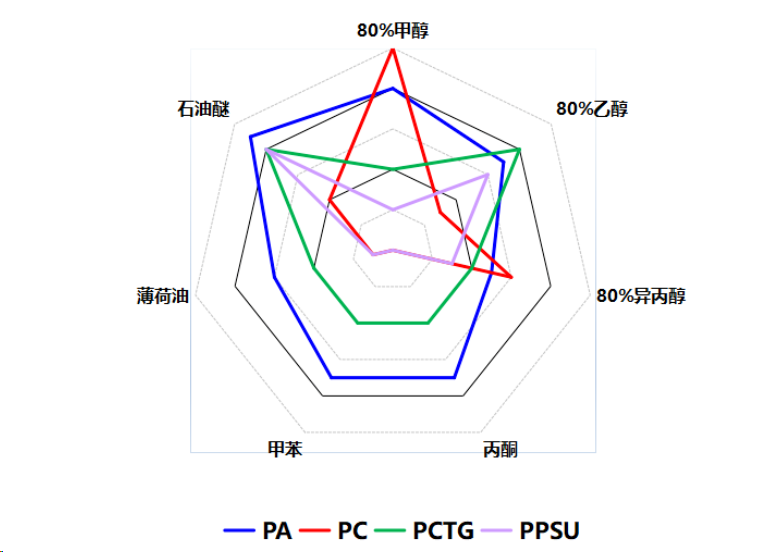 stress cracking is the ability of a material to resist chemicals when stressed. medical devices made of materials such as pc, pctg and ppsu often suffer from cracking problems, especially after exposure to chemicals. it can be found through the spider web diagram that grilamid