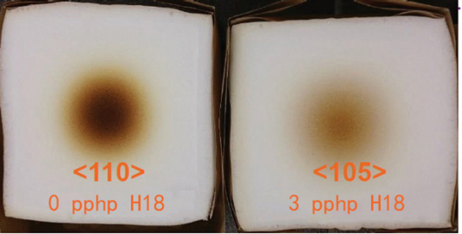 nt h18 can be used not only to increase hardness, but also to reduce the amount of tdi, polymerized polyols or tin in a formulation while maintaining sponge hardness. therefore, it can be used to reduce costs and facilitate process conditions (reaction temperatures) if desired. as shown in table 2, the addition of 3 pphp of nt h18 to a sponge with a density of 21 kg/m3 reduces the tdi index from 105 to 100 under laboratory conditions of the reference formulation, the hardness remains almost constant, and the yellowing of the sponge can be significantly improved, as shown in figure ii.