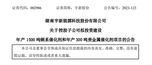 yuxin co., ltd. announced on november 8 that hunan yuxin energy technology co., ltd. (referred to as “yuxin co., ltd.”) plans to invest in the construction of an annual production capacity of 1,500 through its holding subsidiary huizhou boko environmental protection new materials co., ltd. tons of copper catalysts and an annual output of 300 tons of precious metal catalyst projects.