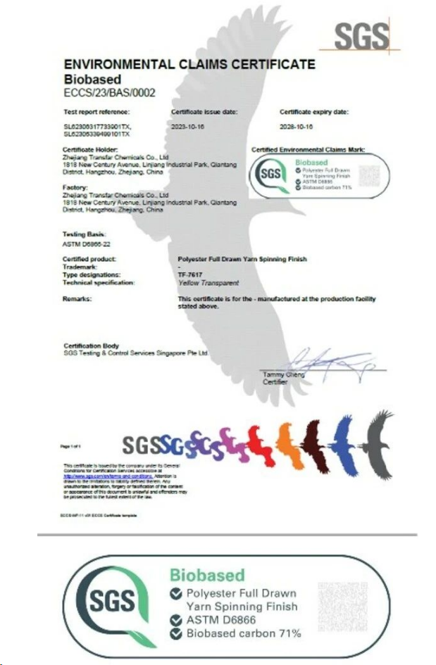 sgs verified the bio-based content of this product based on the astm d6866 standard. the results showed that the bio-based carbon content of the product was 71%, which complied with the relevant requirements of sgs green mark product certification. the certified chuanhua brand tf-7617 polyester fdy oil product is generally suitable for conventional and coarse denier fdy processes. it has the advantages of good heat resistance and wear resistance. it ensures its high-quality performance and is suitable for polyester. the green development path of products has been completely explored.