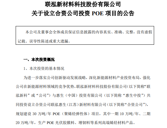 on august 23 this year, levima new materials technology co., ltd. and wison (china) investment co., ltd. jointly invested in the establishment of levima wison (jiangsu) new materials co., ltd. among them, levima new technology invested 455 million yuan, accounting for 65% of the registered capital of the joint venture company; wison cic invested 245 million yuan, accounting for 35% of the registered capital of the joint venture company. levima wison new materials is mainly engaged in the business of high-end olefin materials such as poe (polyolefin elastomer), and plans to build a300,000 tons/year poe project, including a 100,000 tons/year phase one and a 200,000 tons/year phase two produces high-end products such as poe photovoltaic film materials and toughening materials.