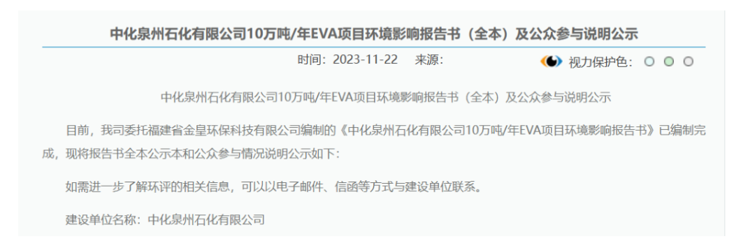 on november 22, sinochem quanzhou’s official website released the environmental impact report (full version) and public participation instructions for the 100,000 tons/year eva project of sinochem quanzhou petrochemical co., ltd., and the project passed the filing approval , providing suggestions and opinions on the project construction content to all sectors of society.