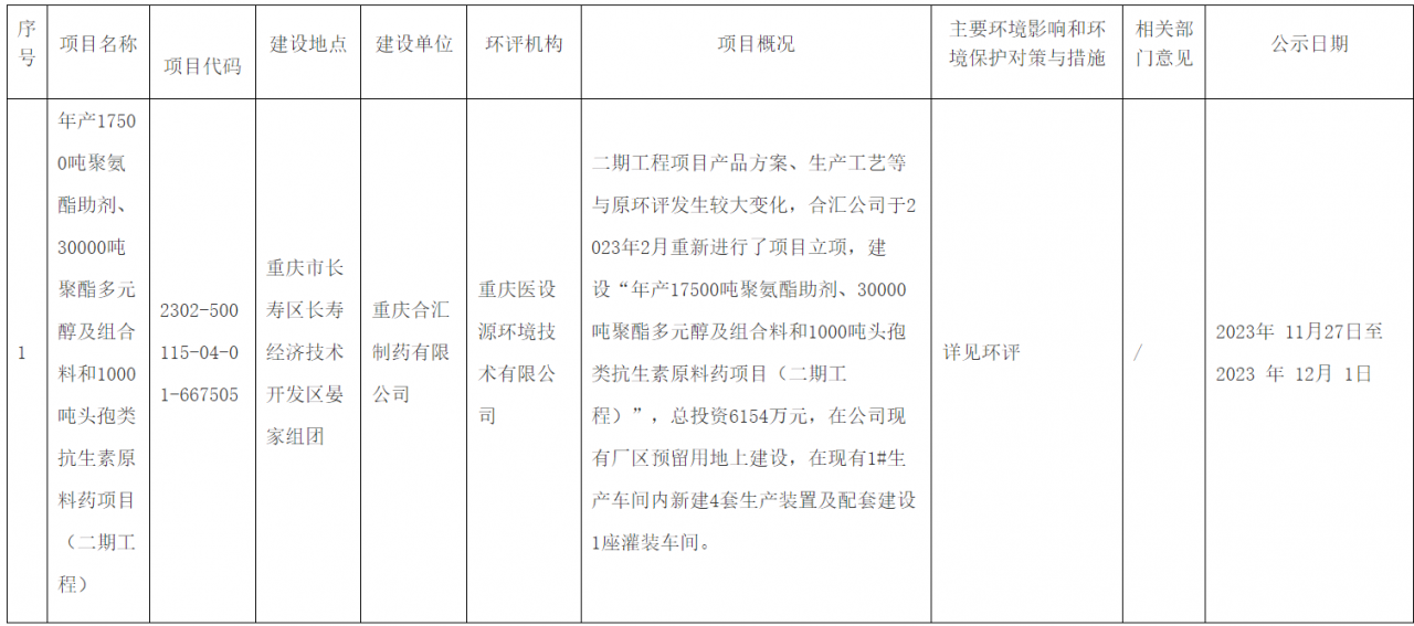 on november 27, 2023, the chongqing changshou district ecological environment bureau announced that it plans to approve chongqing hehui pharmaceutical co., ltd.’s “annual production of 17,500 tons of polyurethane additives, 30,000 tons of polyester polyols and combination materials and environmental impact assessment information for the 1,000-ton cephalosporin antibiotic api project.